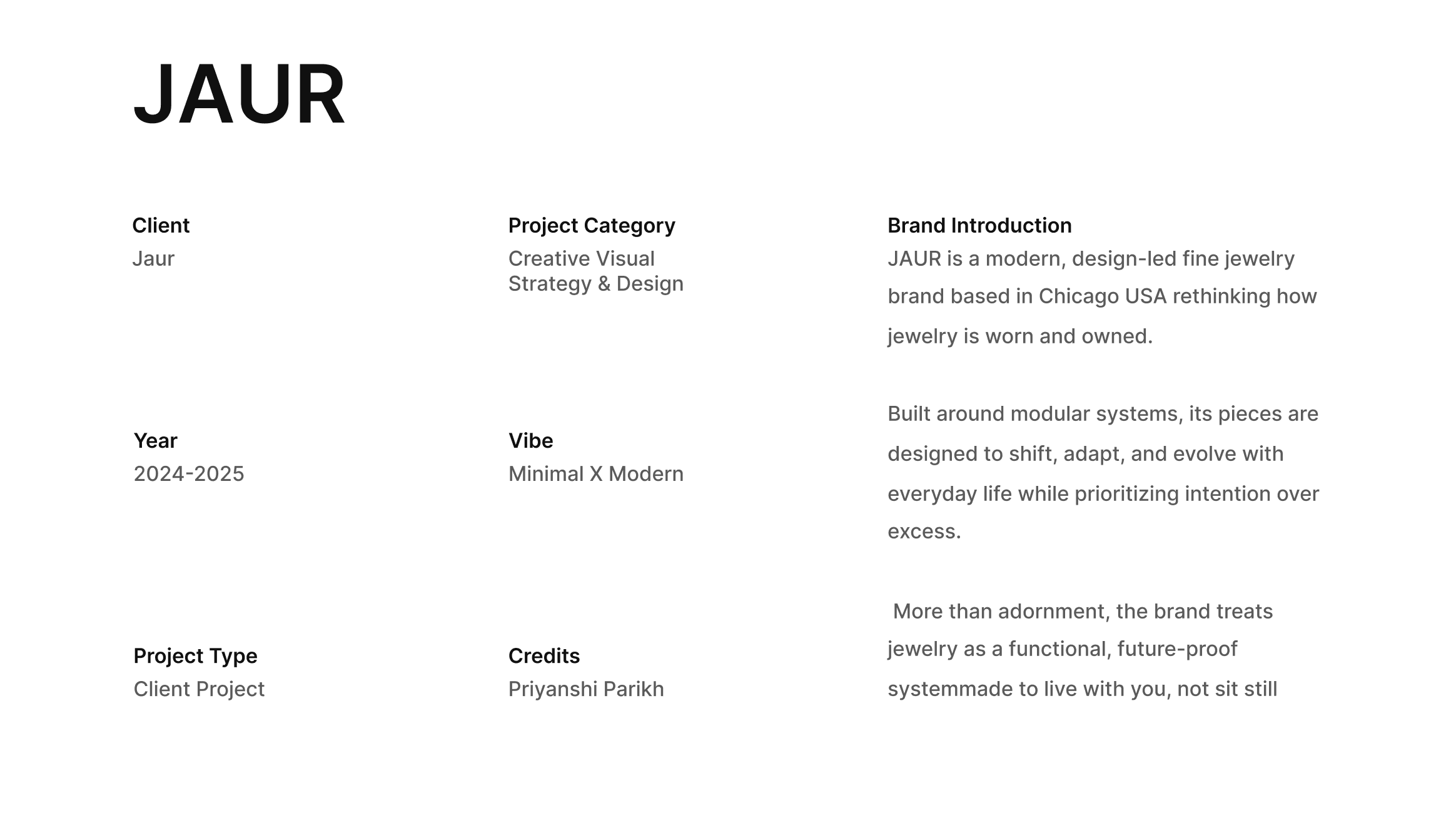 JAUR is a modern fine jewelry brand offering thoughtfully designed, versatile pieces — often modular and crafted in small batches — that are built to adapt to personal style rather than traditional luxury norms.